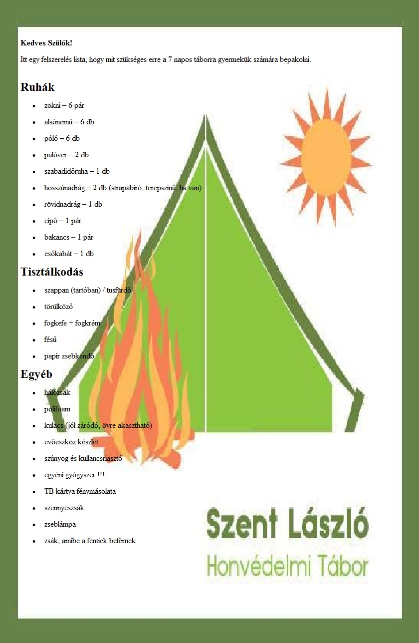 Jelentkezés: Jelentkezni a sztlaszlo.tabor@gmail.com e-mail címen lehet. Újabb információk a Facebook oldalon folyamatos frissítéssel találhatók. (Pl: szükséges adatlapok, felszerelési lista, stb…) A jelentkezés csak a minimum 50% (10.000,- Ft) előleg befizetésével válik érvényessé. Ezt legkésőbb 2015. 06. 13-14-én a lövészklub épületében lehet megtenni. Addig pedig átutalással az alábbi számlára: MKB 10300002-10618322-49020017 Szent László Aranyos Szegellete Egyesület. Megjegyzés rovatba: Tábor 2015/1 . A fennmaradó összeget legkésőbb a táborba érkezéskor kell befizetni.